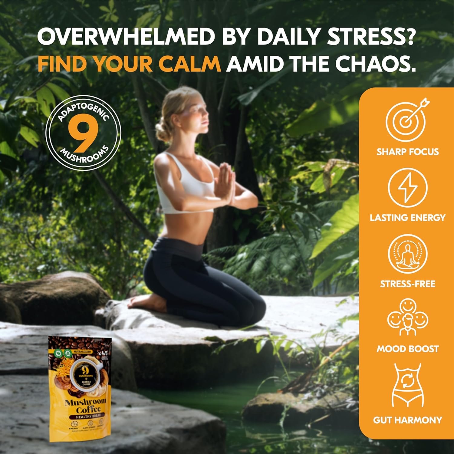 • Energy & Mental Clarity: Low-caffeine mushroom coffee enhances focus, memory, and digestion, while vitamins with ginger and turmeric help balance energy levels and keep you active.